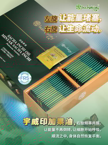 宇威印加果油经FRS Frequency Recode System™调频至右旋频率,分子自旋方向顺应自然能量流,让身体由堵转通、由滞转活。