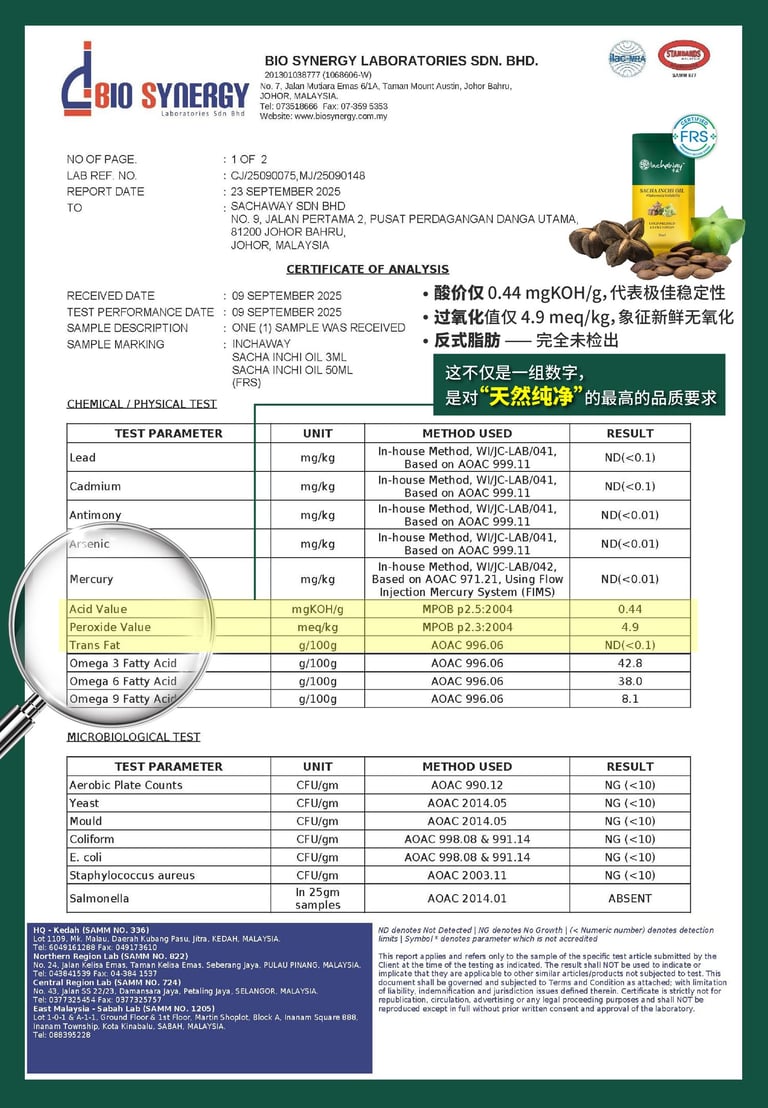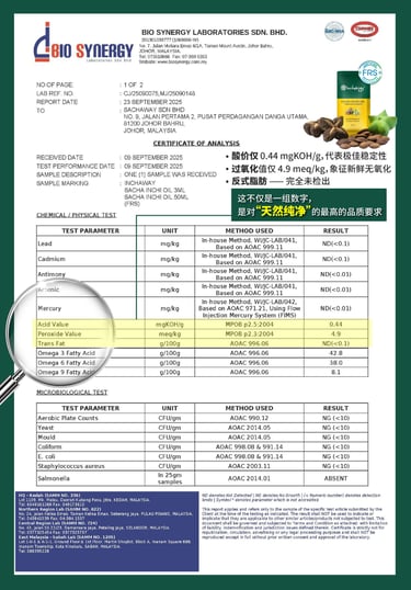 由马来西亚国家认证实验室 Bio Synergy Laboratories 全面检测,